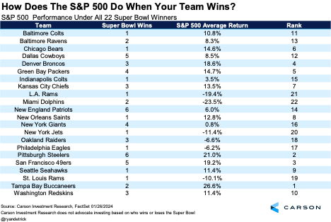 Getting to the two teams competing this year, the Chiefs have won the Super Bowl three times and stocks gained 13.5%, while the 49ers have won it five times and stocks soared 19.2% on average.